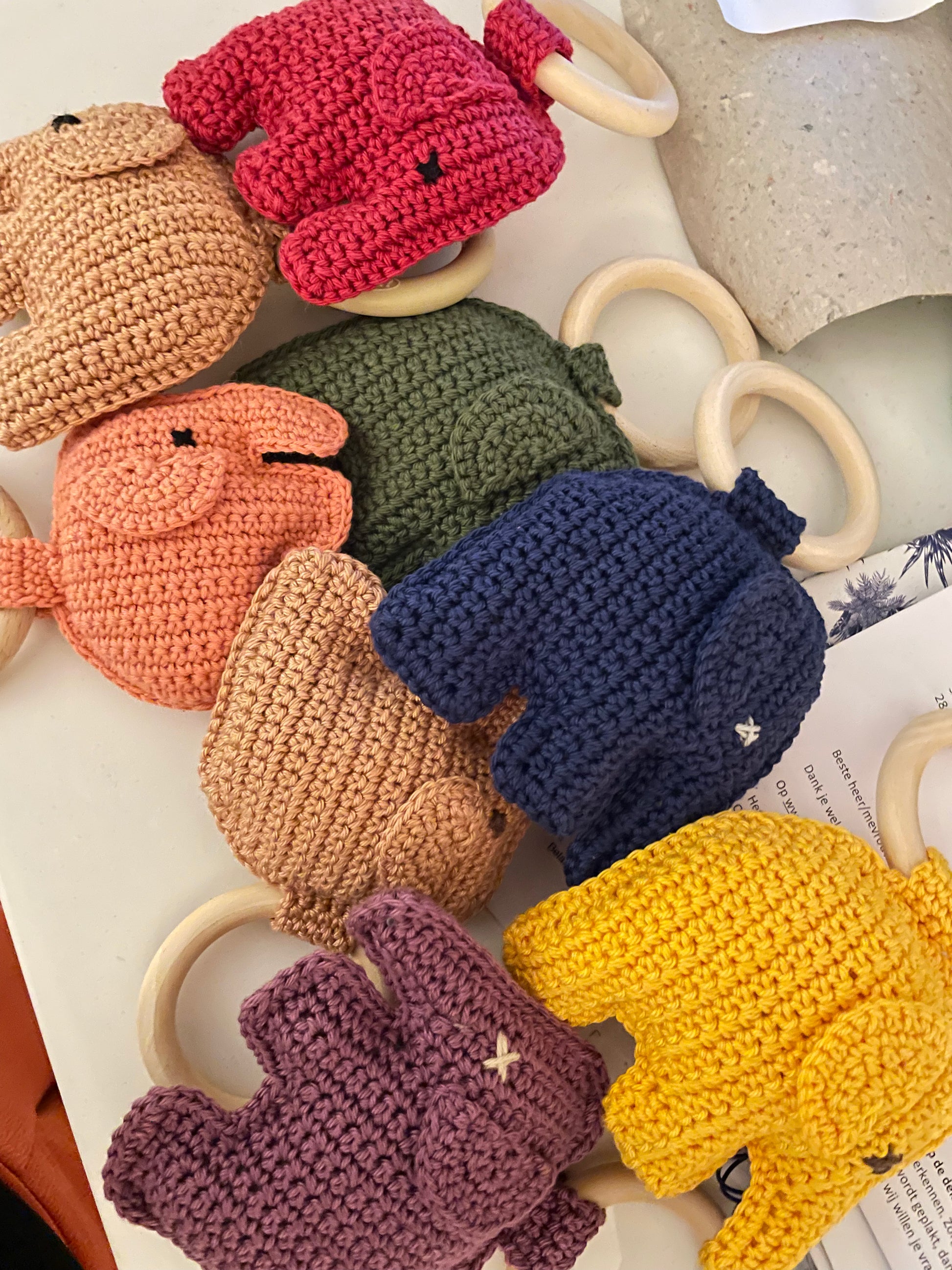 Wellicht een leuk feitje om te weten; Kelly, de eigenaresse van de webshop haakt deze prachtige rammelaar in de vorm van een olifant zelf. Uiteraard houdt ze daarbij rekening met de veiligheidseisen voor knuffels voor baby's. De rammelaar is verkrijgbaar in 3 zachte kleuren. Je kan kiezen uit mint groen, zalm roze en caramel (zie foto's).
